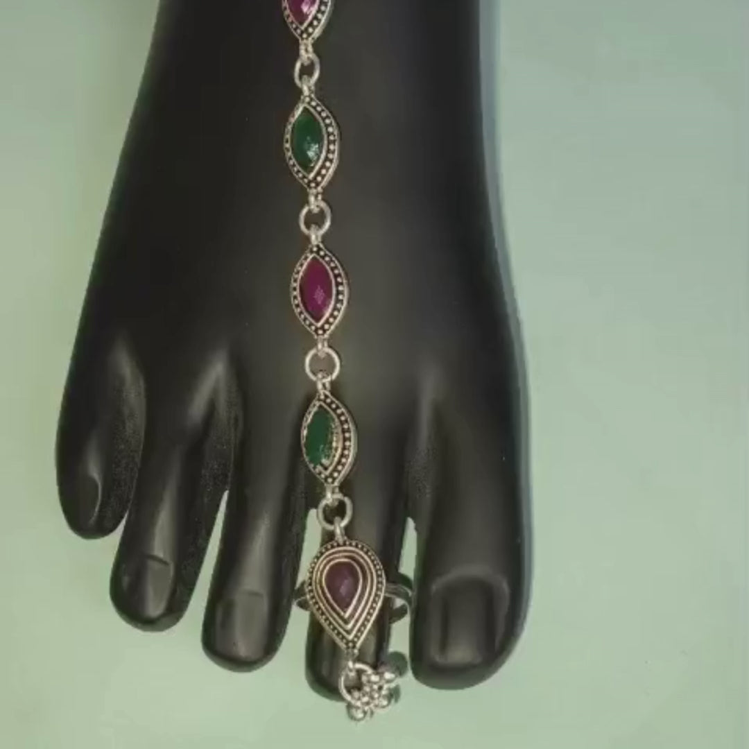 A stunning fusion of tradition and contemporary style. This handcrafted silver replica-finish anklet features alternating marquise-cut emerald color and ruby color stones, leading to a matching toe ring. Perfect for bridal wear or festive occasions where you want to make a graceful statement.